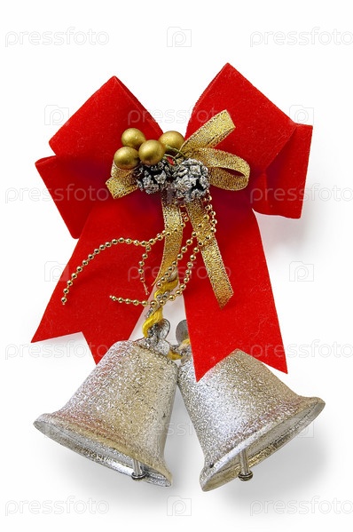 Два рождественских колокольчика с красным бантом и золотистыми украшениями на белом фоне