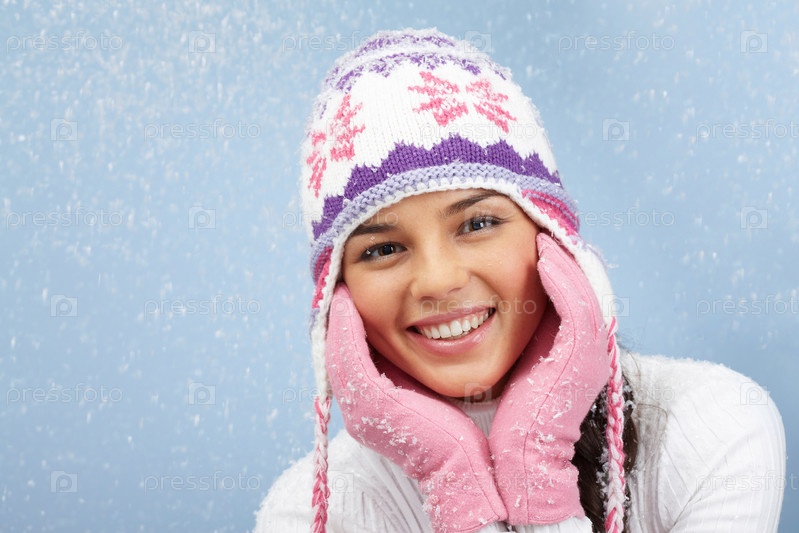 Молодая девушка в зимней одежде на голубом фоне