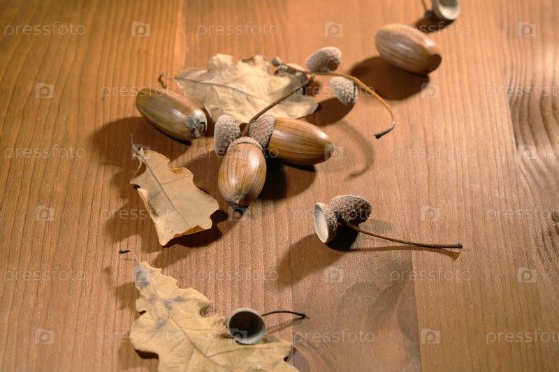 Сухие дубовые листья и желуди на деревянном фоне крупным планом