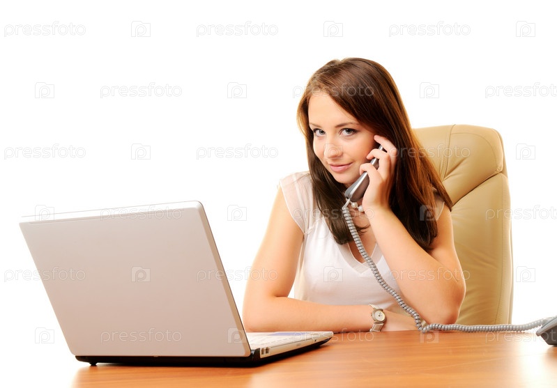 Молодая девушка за ноутбуком разговаривает по телефону