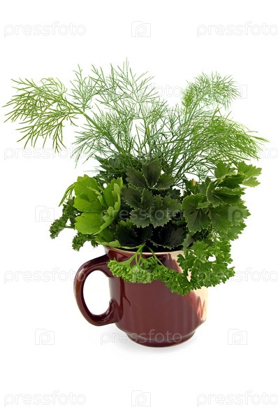 Петрушка, сельдерей и укроп в керамической кружке