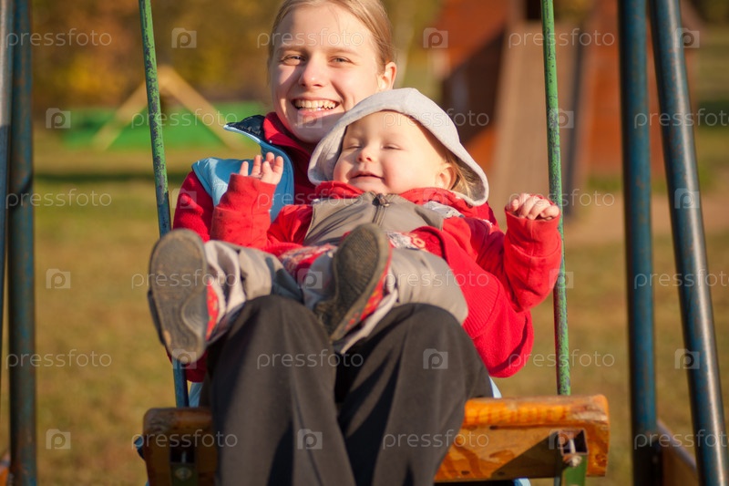 Мама с ребенком на качелях в осеннем парке