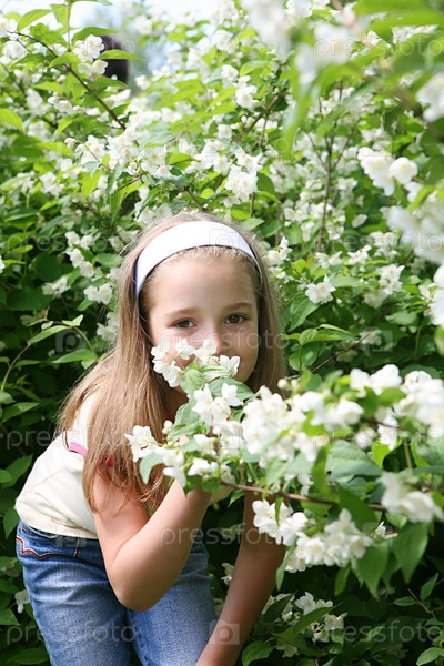 Девочка на фоне цветущей яблони