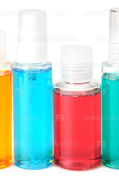 Жидкое мыло, гель, шампунь, масло на белом фоне
