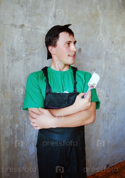 Молодой маляр в рабочей форме и кистью в руке