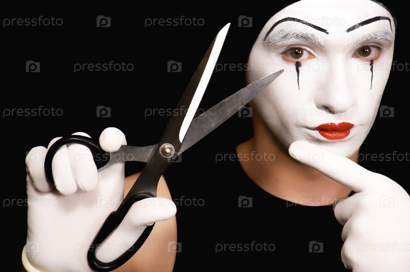 Портрет мима с ножницами на черном фоне