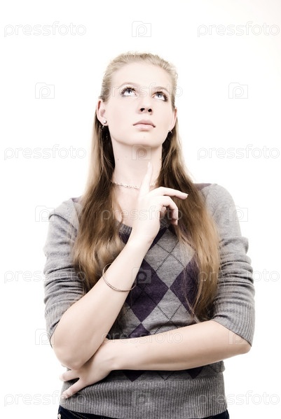 Портрет задумчивой длинноволосой девушки, изолированной на белом фоне