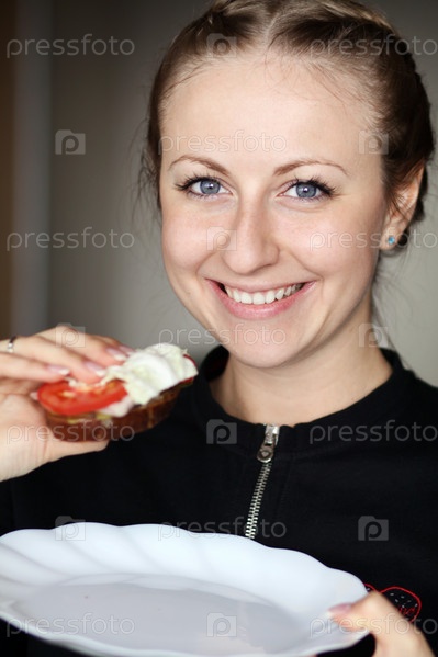 Молодая симпатичная брюнетка с бутербродом