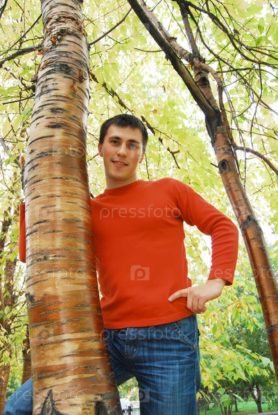 Портрет молодого человека в парке на фоне деревьев
