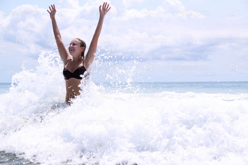 Счастливая девушка в море с поднятыми вверх руками