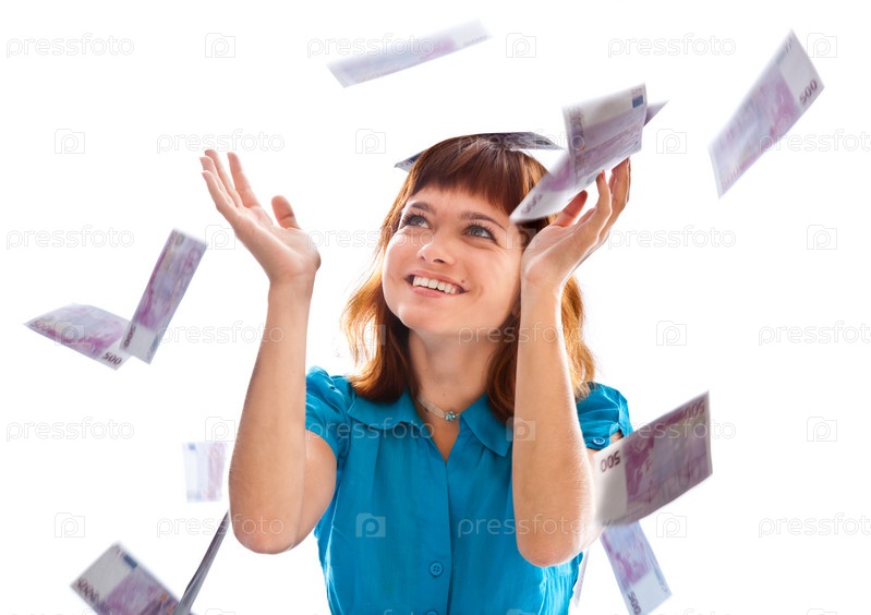 На девушку падают банкноты достоинством 500 евро, белый фон