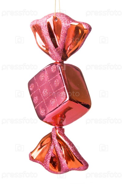 Новогодняя игрушка в виде конфеты на белом фоне
