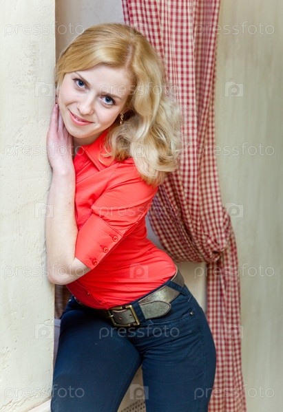 Блондинка стоит у стены