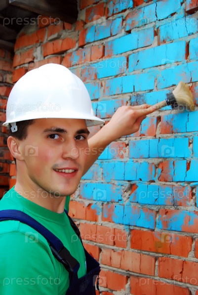 Мужчина в белой каске красит кирпичную стену в синий цвет