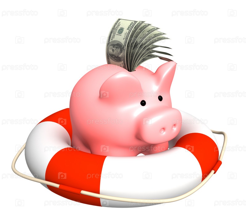 Свинья-копилка и деньги в спасательном круге на белом фоне