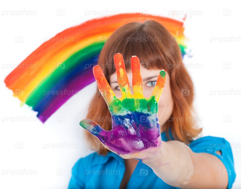 Рыжеволосая девушка-подросток показывает отпечаток радуги на ладони