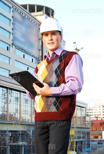 Молодой бизнесмен на стройке в белой каске