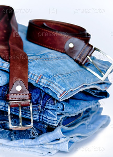Стопка джинсов и ремни на белом фоне