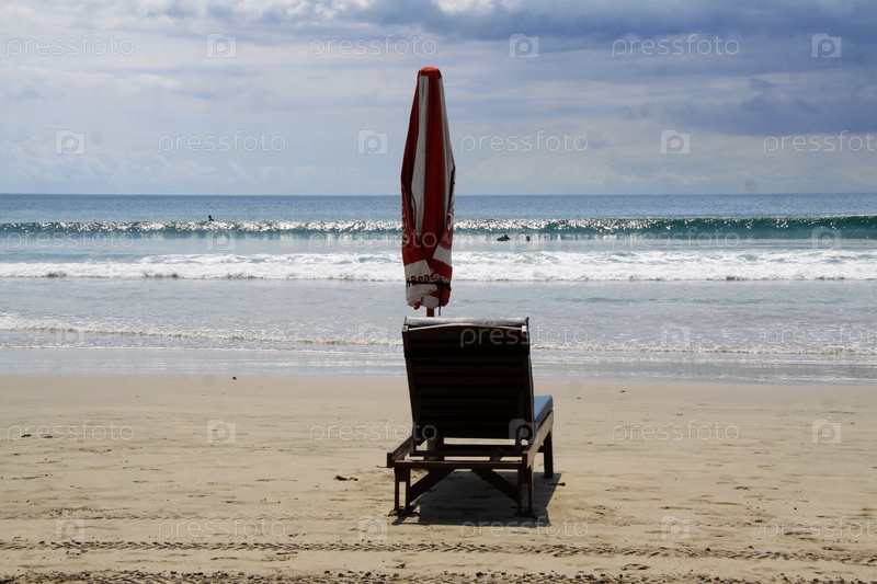 Шезлонг с закрытым зонтиком на пляже возле моря