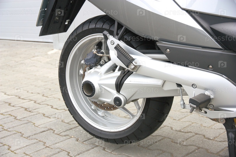 Заднее колесо мотоцикла с хромированным глушителем