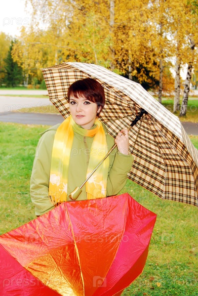 Молодая девушка с двумя зонтами на фоне осенней природы