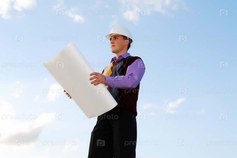 Молодой парень-строитель на фоне голубого неба
