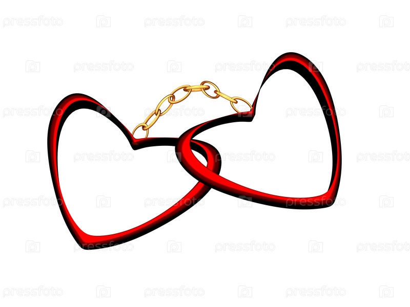 Два красных сердца на золотой цепочке на белом фоне