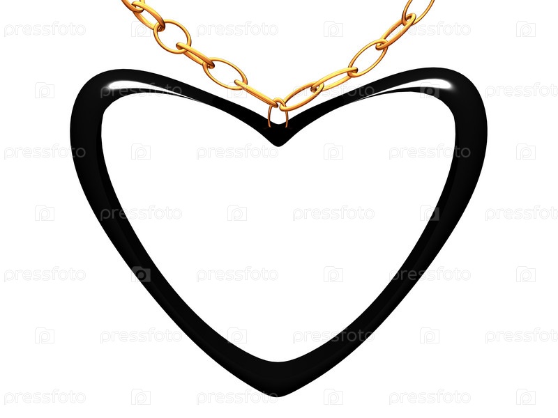 Черный кулон в виде сердца на золотой цепочке на белом фоне