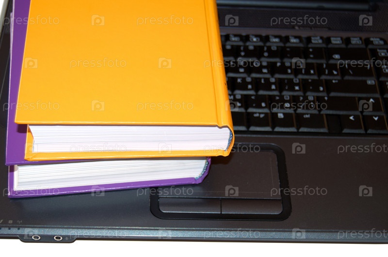 Две разноцветные книги, лежащие на клавиатуре ноутбука