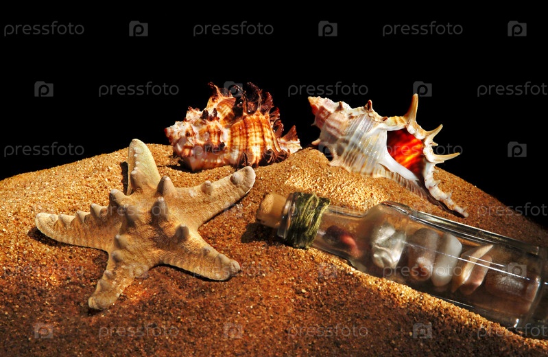 Морские ракушки и камни в бутылке на фоне морского пляжа.Фотография сделана с помощью техники лайфброш.Небольшое освещение