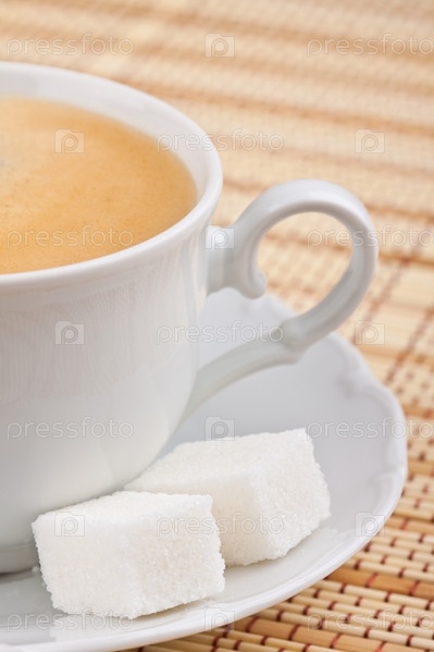 Чашка кофе и два кусочка сахара на блюдце