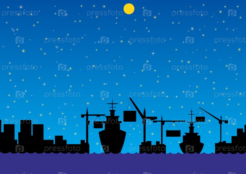 Силуэты домов и кораблей ночью, иллюстрация