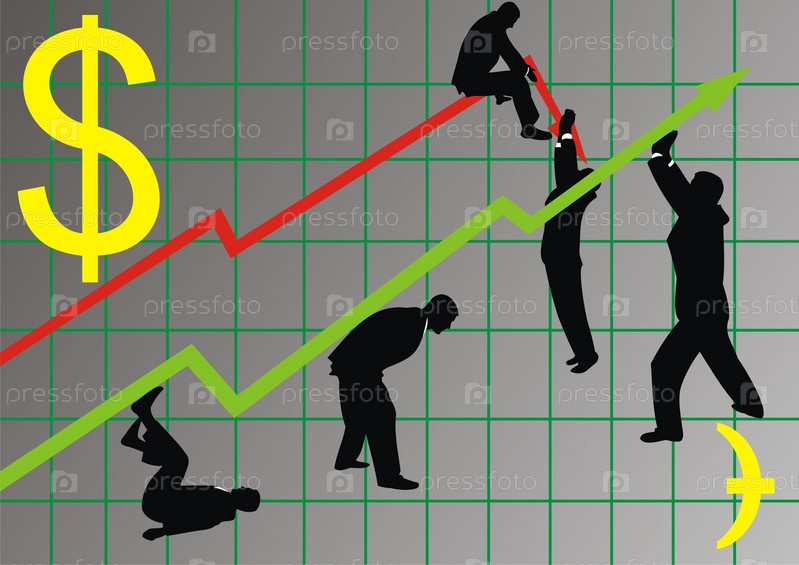 Желтый знак доллара и черные силуэты людей у линий графика на фоне сетки
