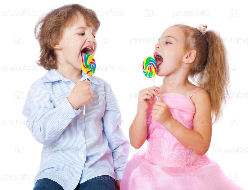 Мальчик и девочка с леденцами. Изолированы на белом фоне