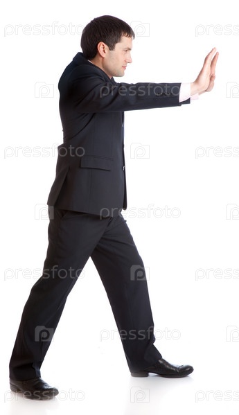 Бизнесмен толкает что-то невидимое. Изолирован на белом