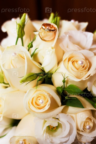 Два обручальных золотых кольца на букете кремовых роз