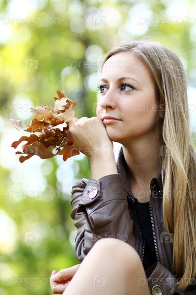 Молодая девушка с осенними листьями в руках