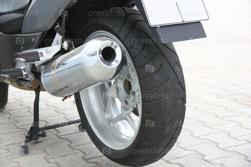 Черное колесо мотоцикла с хромированным глушителем, вид сзади