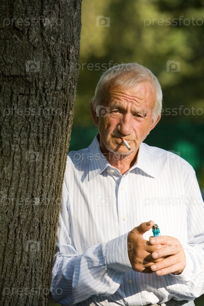 Пожилой мужчина, стоящий около дерева с сигаретой и зажигалкой в руке