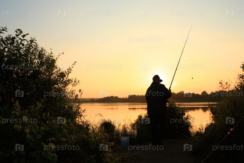 Рыбак в лучах заката готовит рыболовную палочку к выбросу