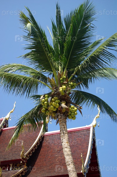 Кокосовая пальма напротив крыши Буддистского храма, Таиланд