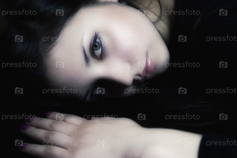Портрет молодой красивой брюнетки с длинными волосами