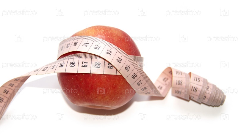 Красное яблоко и сантиметр на белом фоне