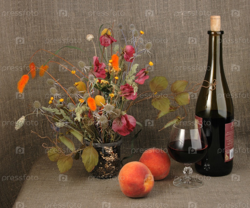 Два апельсиновых персика, букет и красное вино. Близкий план. Абстрактный натюрморт на текстильном льнаном фоне