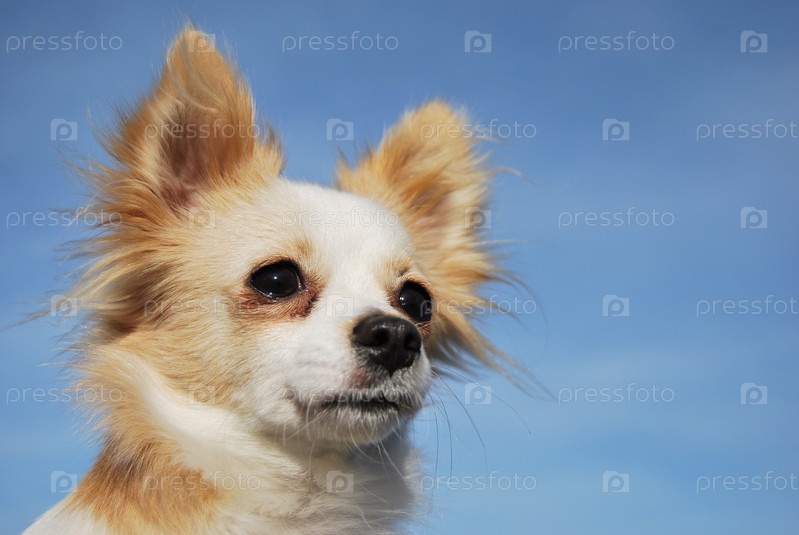 Голова собачки породы чихуахуа на фоне голубого неба