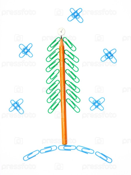 Рождественская ель из канцелярских принадлежностей на белом фоне