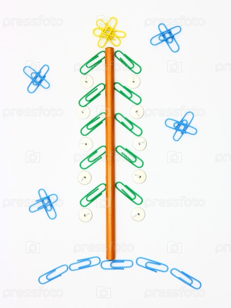 Рождественская ель из канцелярских принадлежностей на белом фоне
