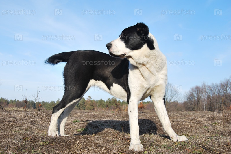 Среднеазиатская овчарка в поле на фоне голубого неба