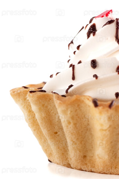 Пирожное со взбитыми сливками на белом фоне