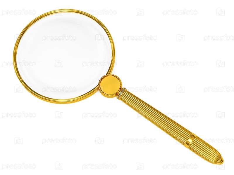 Золотое увеличительное стекло на белом фоне